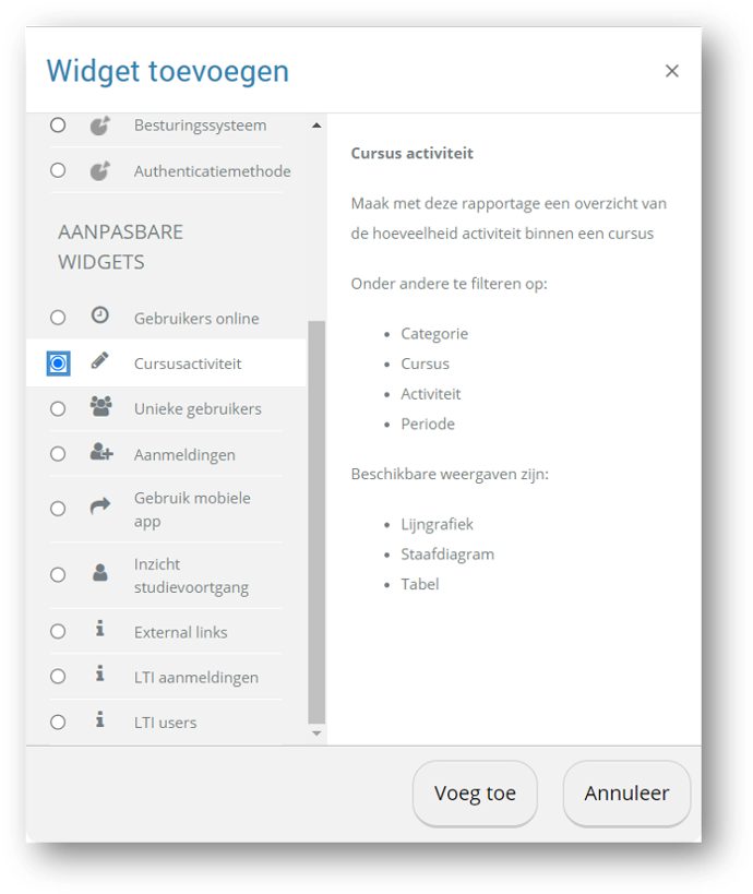 'Inzicht' stelt u in staat om aangepaste rapporten, grafieken en tabellen te maken, direct binnen Moodle. Dit elimineert de noodzaak voor externe tools, en brengt cruciale data binnen handbereik.